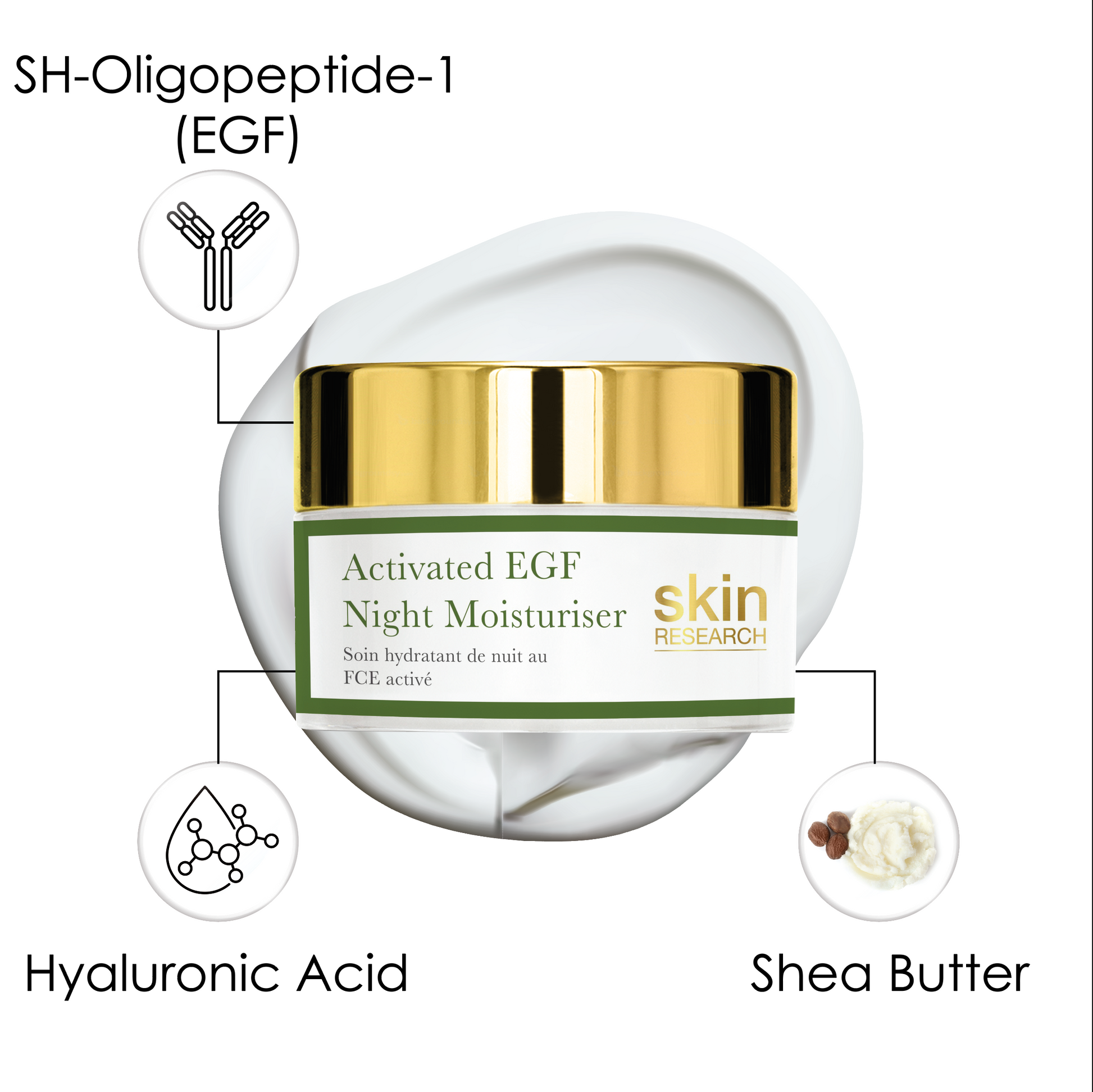 Inspired by EGF technology, our Activated Night Moisturiser aims to deliver impressive results while you sleep, to leave your complexion looking smoother and revived. Key ingredient SH-Oligopeptide-1 has an identical chemical structure to an epidermal growth factor that works to increase the rate of renewal of the skin, as well as slowing the thinning of aging skin and smoothing the look of wrinkles and fine lines. Camellia Oil and Shea Butter both have super hydrating qualities which help to prevent epidermal moisture loss and increase nourishment whilst Shea to ensure you wake up to a plump, youthful looking complexion.
